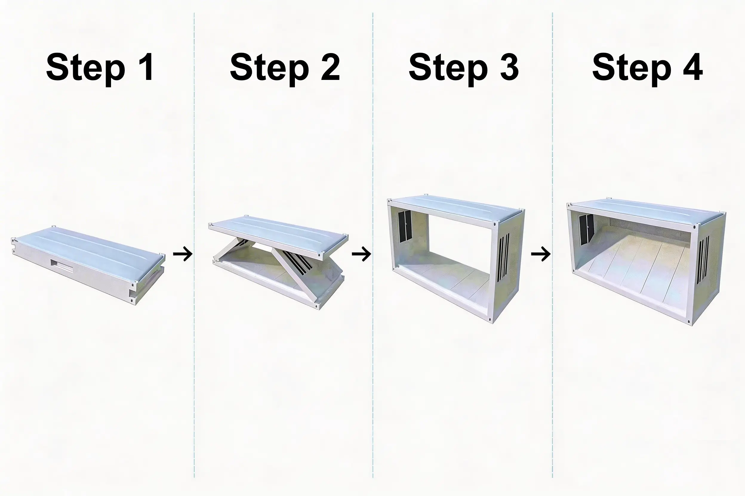 Our foldable containers are engineered for durability and easy assembly. The robust structure features high-quality top and bottom frames supported by sturdy corner columns. Each unit is fully integrated with wall panels, cement fiber board flooring, and essential fixtures including doors, windows, and a pre-installed electrical distribution box. For multi-story configurations, we also provide integrated staircases to ensure a complete, ready-to-use modular solution.